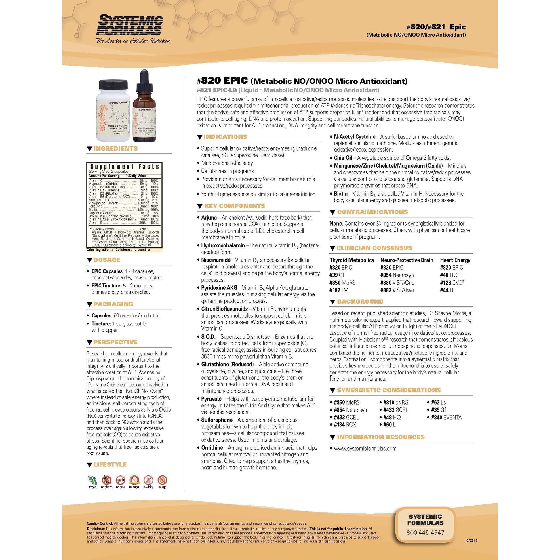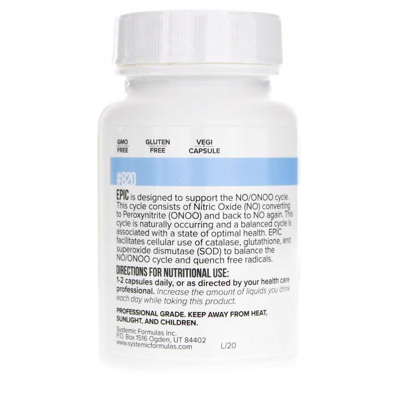 This formula is a powerful intracellular antioxidant, which enhances the cell's ability to generate glutathione and S.O.D. (superoxide dismutase) in response to oxidative stress.Systemic's Dr. Morris, Ph.D developed Epic as part of their nutrimetabolomic research. This formula is a powerful intracellular antioxidant, which enhances the cell's ability to generate glutathione and S.O.D. (superoxide dismutase) in response to oxidative stress. In addition, it provides novel bioflavonoids acting specifically against superoxide and peroxynitrite (ONOO) free radicals. Epic allows the cells to choose to make glutathione (GSH), the body's premier antioxidant and detoxifying molecule.