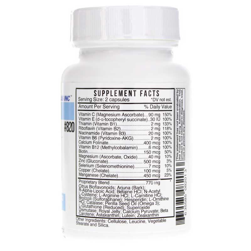 Vitamin C, Magnesium (Oxide), Vitamin B3 (Niacinamide), Vitamin B1 (Thiamine), Vitamin B2 (Riboflavin), Vitamin B6 (Pyridoxine-AKG), Zinc (Chelate), Manganese (Chelate), Folic Acid, Biotin, Copper (Chelate), Selenium (Selenomethionine), Vitamin B12 (Hydroxycobalamin), Vitamin E, Arjuna, Citrus Flavanoids, Arginine, Broccoli (Sulforophane), Ornithine, Pyruvate, Alpha Lipoic Acid, Betaine, L-Carnitine, N Acetyl Cysteine, Hesperdin, Carotenoids, Chia Oil (Omega 3), S.O.D., Glutathione (Reduced), Royal Jelly.
