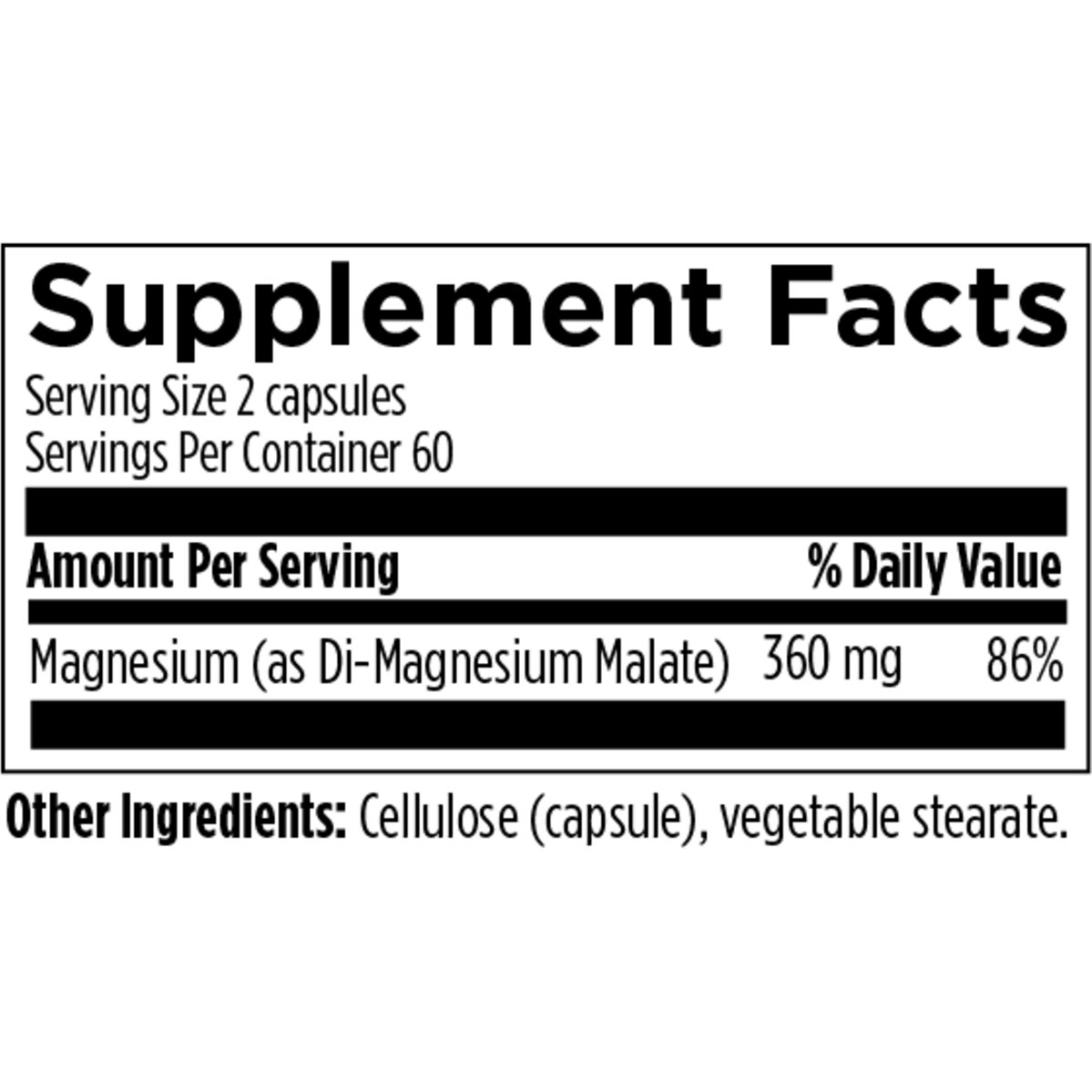 Magnesium Malate is a highly bioavailable form of magnesium. It contains di-magnesium malate, which is magnesium bound to malic acid. Magnesium is one of the most critical minerals in the human body and is involved in hundreds of enzyme reactions. Malic acid is naturally found in apples and other fruits and vegetables. It is included because of its role in the Krebs cycle, the energy-producing system in the body, and is made with non-GMO ingredients.