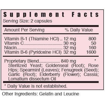INGREDIENTS: Spring Water, Active Constituents of Yeast, Rose Hips, Golden Seal (Root), Niacin, Pyridoxine HCl, Ascorbic Acid, Spearmint (Leaves), Fenugreek (Seed), Thiamine HCl, Garlic (Root), Elder (Flower), Cassia Oil, Leptotaenia Oil, Leucine, Gain Alcohol.
