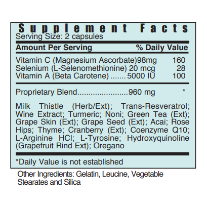 Vitamin C (Ascorbate, Rose Hips), Selenium (Chelate), Vitamin A (Beta Carotene), Trans-Resveratrol, Wine Extract, Acai, Noni, Green Tea Extract, Turmeric, Thyme, Grape Seed Extract, Cranberry Extract, Milk Thistle, CoQ-10, Creatine, L-Arginine, Grapefruit Flavonoids, Oregano Oil, Tyrosine, Arisaematis Rhizoma Preparatum, Yellow Dock (Herb), Sete Sangrias (Herb), Saussurea (Root), Golden Seal (Root), Earth Tonify**Earth Tonify is an herbal blend from Systemic Formulas that includes RNA/DNA Blood Substance, Magnolia (Bark), Dioscorea Hypoglauca, Saussurea (Root), Zanthoxylum Fruit (Peel), Alpinia Rhizome, Canaigre (Root), Licorice (Chinese Root), RNA/DNA Kidney Tissue Factors, Cardamom (Fruit), Lotus (Seed), Dong Quai (Herb), Pinellia Rhizome, RNA/DNA Liver Tissue Factors, Dolichos Bean, Astragalus (Root), RNA/DNA Spleen Tissue Factors.