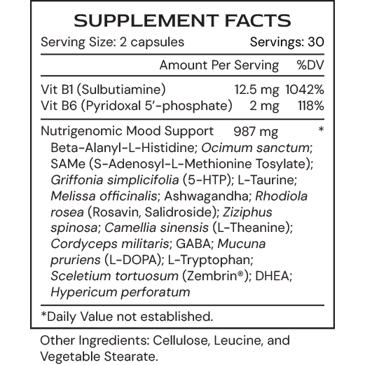 Vitamin B1, Vitamin B6, Nutrigenomic Mood Support: Beta-Alanyl-L-Histidine, Ocimum sanctum, SAMe, Griffonia simplicifolia (5-HTP), L-Taurine, Melissa officinalis, Ashwagandha, Rhodiola rosea, Ziziphus sponosa, Camellia sinensis (L-Theanine), Cordyceps militaris, GABA, Mucuna pruriens (L-DOPA), L-Tryptophan, Sceletium tortuosum (Zembrin), DHEA, Hypericum perforatum. Other Ingredients: Cellulose, Leucine, and Vegetable Stearate.