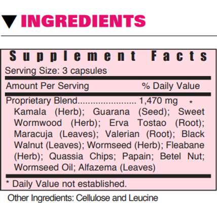 INGREDIENTS:Â Proprietary Blend: Kamala (Herb); Guarana (Seed); Sweet Wormwood (Herb); Erva Tostao (Root); Maracuja (Leaves); Valerian (Root); Black Walnut (Leaves); Wormseed (Herb); Fleabane (Herb); Quassia Chips; Papain; Betel Nut; Wormseed Oil; Alfazema (Leaves). Other Ingredients: Cellulose and Leucine.Â