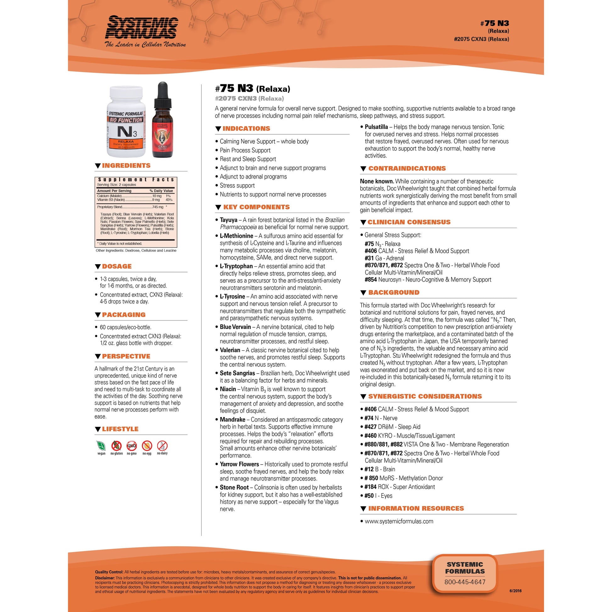 Systemic Formulas #75 – N3 Relaxa is a natural nervine blend formulated to support relaxation and overall calm. This gentle, chemical-free and non-toxic formula provides nutrients traditionally used to help ease tension and promote a balanced sense of well-being.