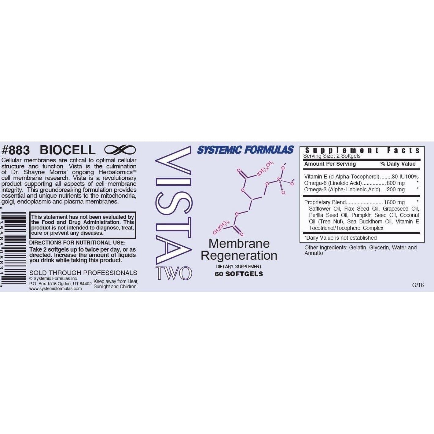 Vista is the culmination of Systemic Formulas’ ongoingnutrigenomic and metabolomic cell membrane research. Vista is a revolutionary product which supports cell membrane integrity via essential phospholipids, antioxidants, amino acids, and botanicals. This groundbreaking formulation provides essential and unique nutrients to the mitochondria, golgi, endoplasmic and plasma membranes. Vista Promotes healthy cell membrane structure and helps maintain overall health.* The VISTA formula comes in three components packaged in two bottles (there is also an additional LQ for Vista 2, if a liquid is preferred).