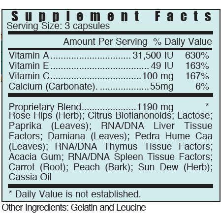 Vitamin A, Vitamin E, Vitamin C, Calcium Carbonate, Rose Hips (Whole), Orange (Peel), Lactose, Paprika, RNA/DNA Liver Tissue Factors, Citrus Biflavanoids, Damiana (Leaves), Pedra Hume Caa (Leaves), RNA/DNA Thymus Tissue Factors, RNA/DNA Spleen Tissue Factors, Carrot (Root), Peach Bark, Sun Dew Herb, Cassia Aster Blossom.