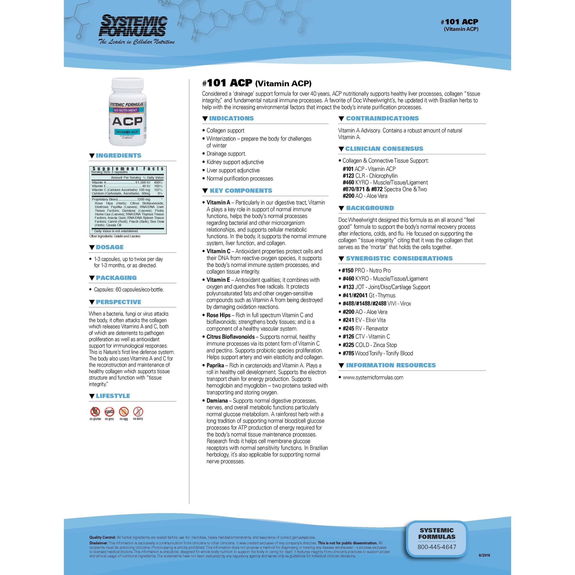 Mild cellular detoxifier. This formula nutritionally supports tissue integrity and strengthens the body's natural immune system; it is specifically effective on tissues and in muscle detoxification. The formula builds collagen while strengthening the shield system. It is good in balancing any cleansing reaction of any kind. ACP is often recommended in conjunction with programs that use formulas #4, ATAK, OXAA, OXCC, OXOX, and any of the VRM formulas. As with any cleansing program, the elimination system must be kept open. Drink at least two quarts of water daily.