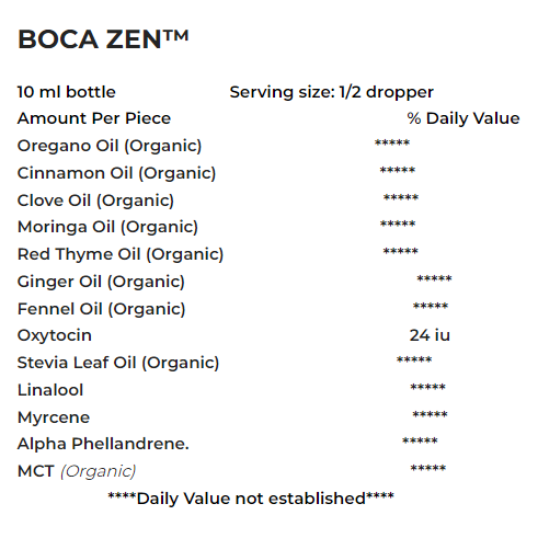 Oregano Oil (Organic), Cinnamon Oil (Organic), Clove Oil (Organic), Moringa Oil (Organic), Red Thyme Oil (Organic), Ginger Oil (Organic), Fennel Oil (Organic), Oxytocin, Stevia Leaf Oil (Organic), Linalool, Myrcene, Alpha Phellandrene, MCT (Organic)