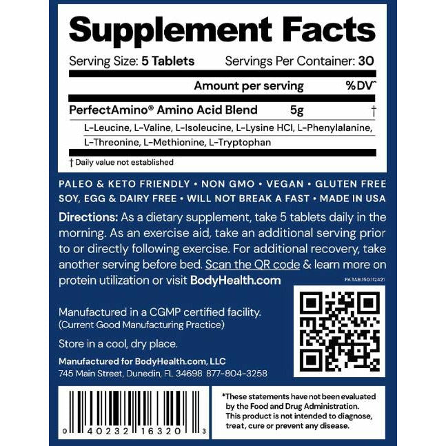 PerfectAmino® contains the eight essential amino acids the body needs to support and maintain its muscular, skeletal, enzymatic, and hormonal systems. The essential amino acids in PerfectAmino are in the exact proportions needed for maximum utilization by the body.