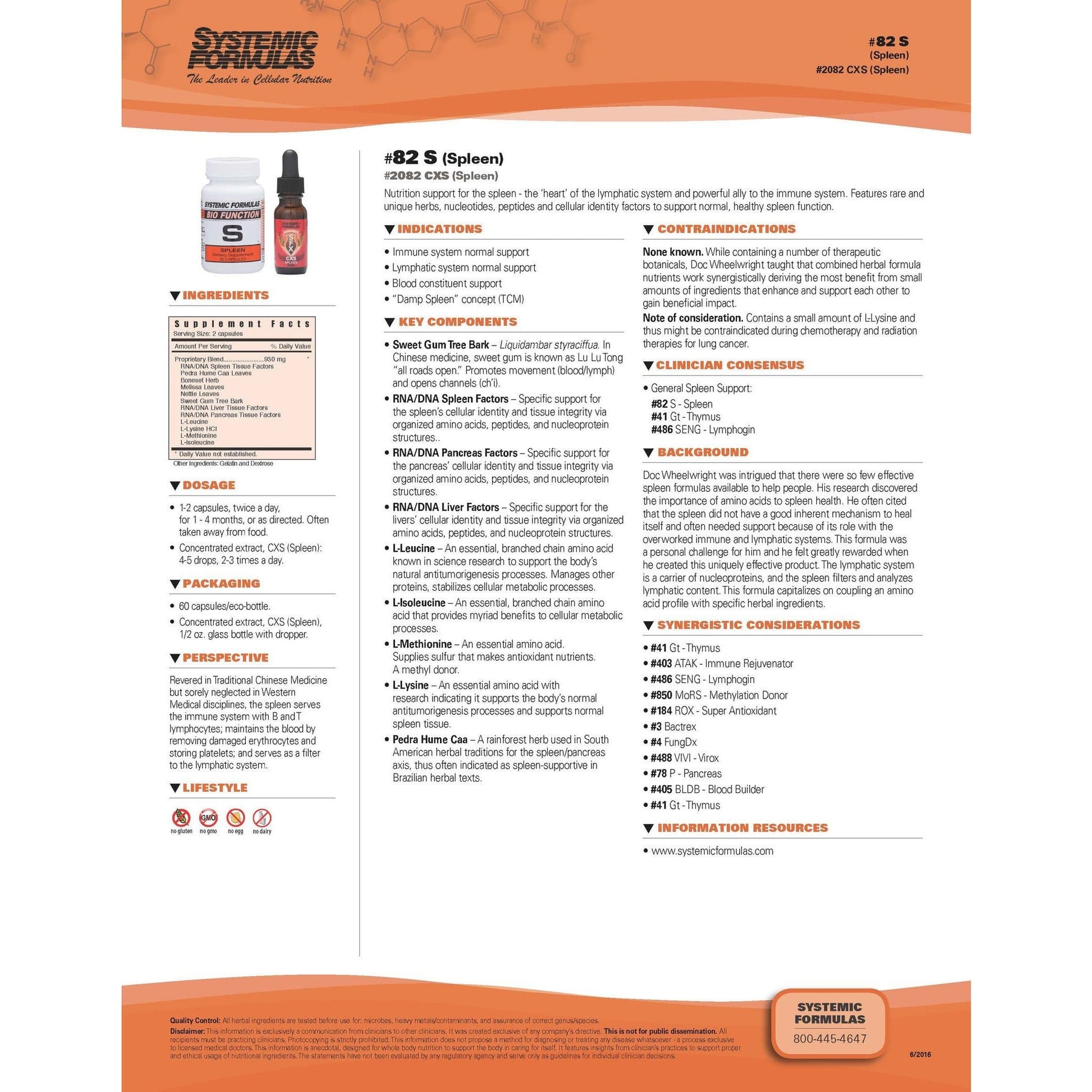Rebuilds the spleen. This formula nutritionally supports spleen health which can influence the lymph and blood systems as well as normalize the immune system. This is the foremost spleen support formula in western nutrition that produces consistent results. Best taken at least 2 hours after or 1 hour before food; works well with formulas L, Ls and ACX.