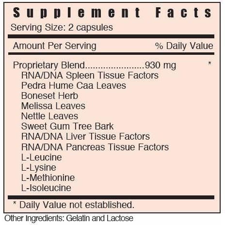 INGREDIENTS: RNA/DNA Spleen Tissue Factors, Pedra Hume Caa (Leaves), Boneset (Herb), Melissa (Leaves), Nettle (Leaves), Sweet Gum Tree (Bark), RNA/DNA Liver Tissue Factors, RNA/DNA Pancreas Tissue Factors, Lysine Mono HCl, dL-Methionine, L-Leucine, L-Isoleucine.Â