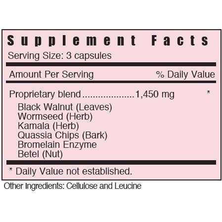 INGREDIENTS: Black Walnut (Leaves), Wormseed (Herb), Kamala (Herb), Quassia Chips (Bark), Bromelain Enzyme, Bethyl Nut.