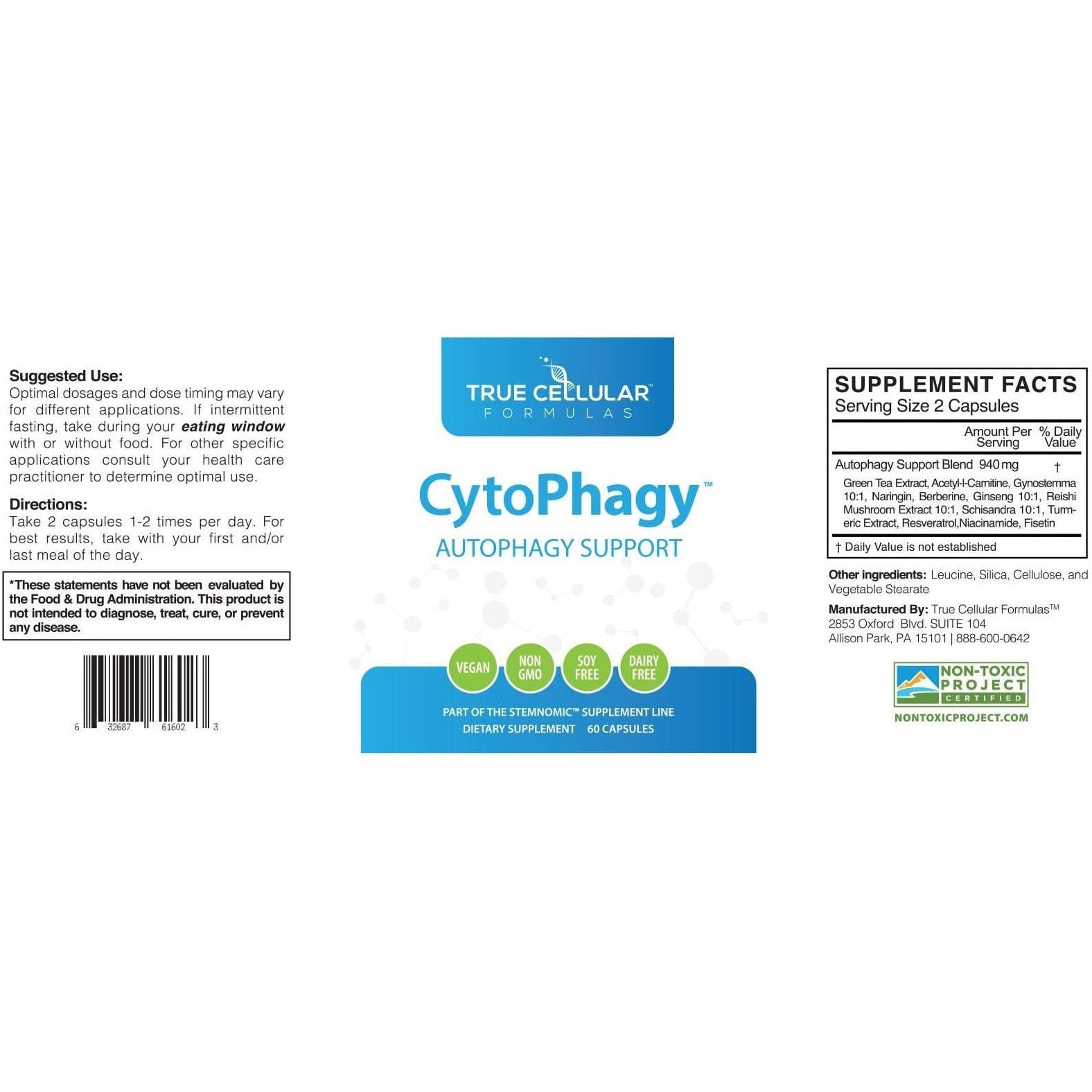 For CytoPhagy, take 2 capsules 1-2 times a day. Dosage and timing may vary depending on your specific needs and any dietary restrictions you may have, such as intermittent fasting. Consult your healthcare practitioner for personalized guidance.