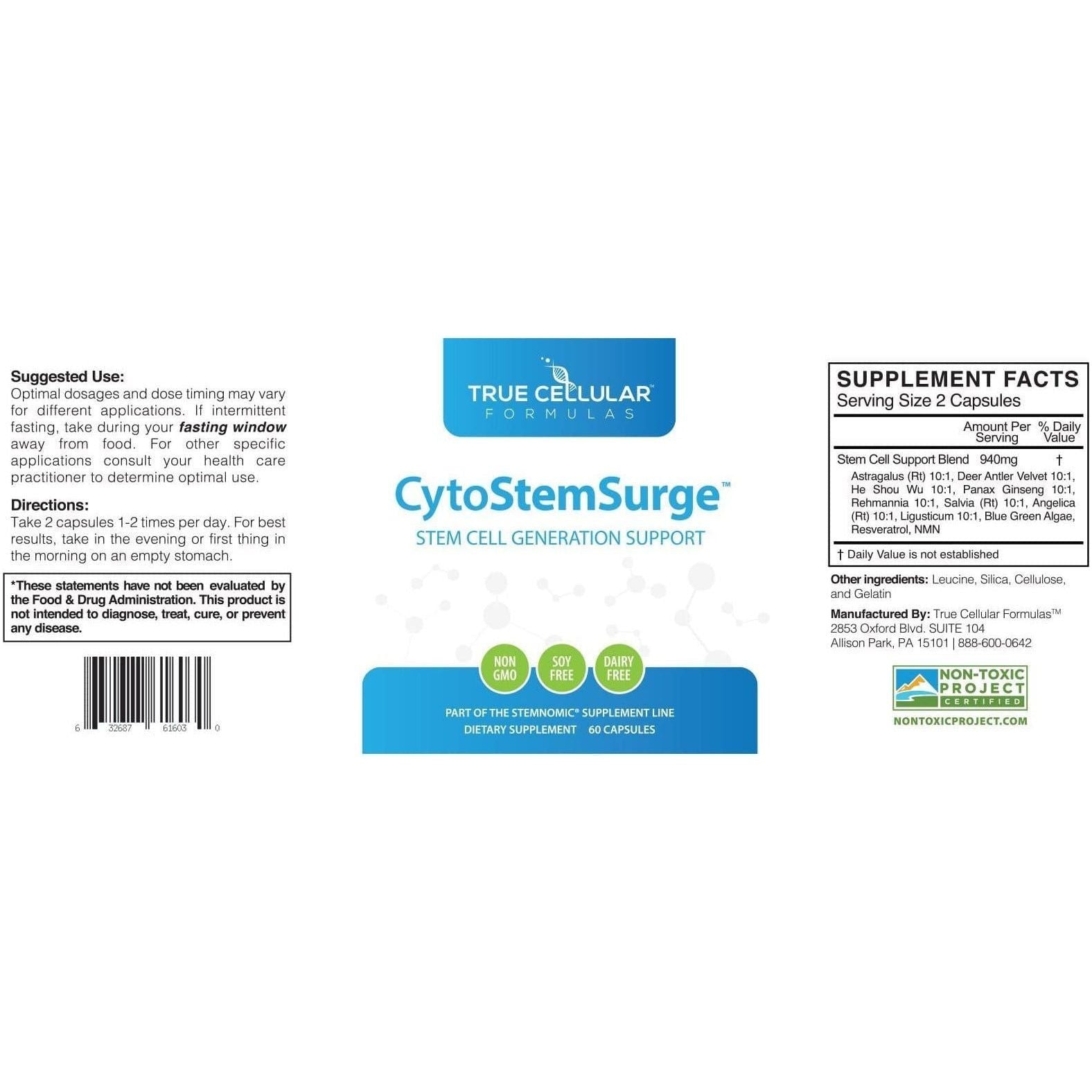 CytoStemSurge contains a Stem Cell Support Blend, including ingredients such as Astragalus, Deer Antler Velvet, He Shou Wu, Panax Ginseng, Resveratrol, and more.