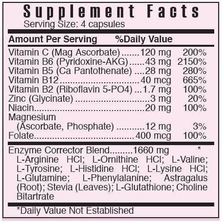 Vitamin C, Vitamin B6 (Pyridoxine-AKG), Vitamin B5, Vitamin B12, Riboflavin 5 Phosphate, Zinc (Glycinate), Niacin, Mg (Phosphate), Folate, L-Arginine, Capsicum, Artemesia, L-Ornithine HCl, Choline, L-Valine, L-Tyrosine, L-Histidine HCl, L-Lysine, L-Glutamine, L-Phenylalanine, Wild Jujube (Seed), Broomrape (Stem), Astragalus (Root), Lucid Ganoderma (Root), Stevia.