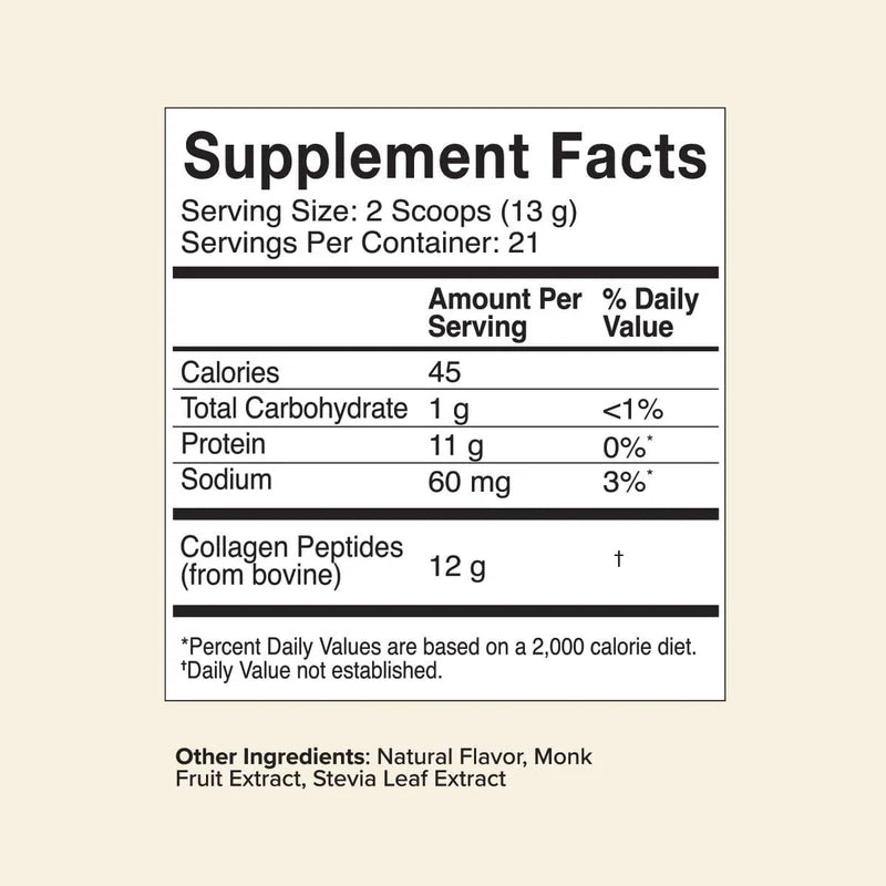Collagen Peptides (from bovine), Natural Flavors, Monk Fruit Extract, Stevia Leaf Extract