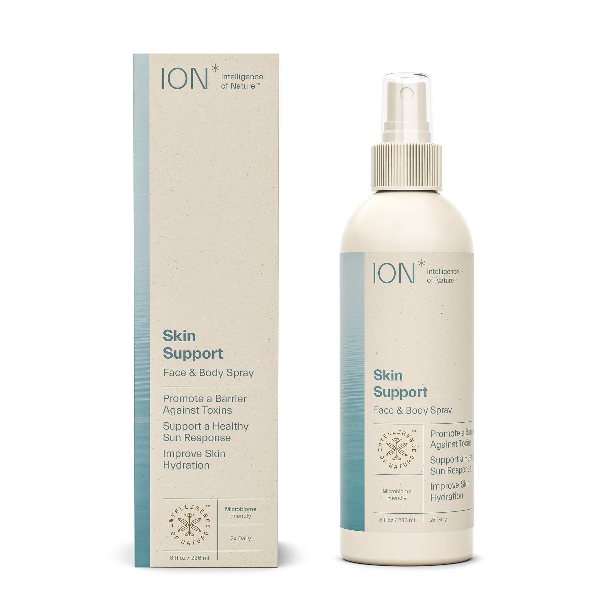 ION* Skin Support spray defends against toxins and facilitates microbial connection, helping to reduce redness and signs of skin damage while also encouraging skin to breathe and glow.