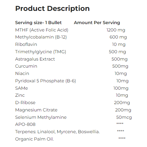 MTHF (Active Folic Acid), Methylcobalamin (B-12), Riboflavin, Trimethylglycine (TMG), Astragalus Extract, Curcumin, Niacin, Pyridoxal 5 Phosphate (B-6), SAMe, Zinc, D-Ribose, Magnesium Citrate, Selenium Methylamine, APO-808, Terpenes: Linalool, Myrcene, Boswellia, Organic Palm Oil.