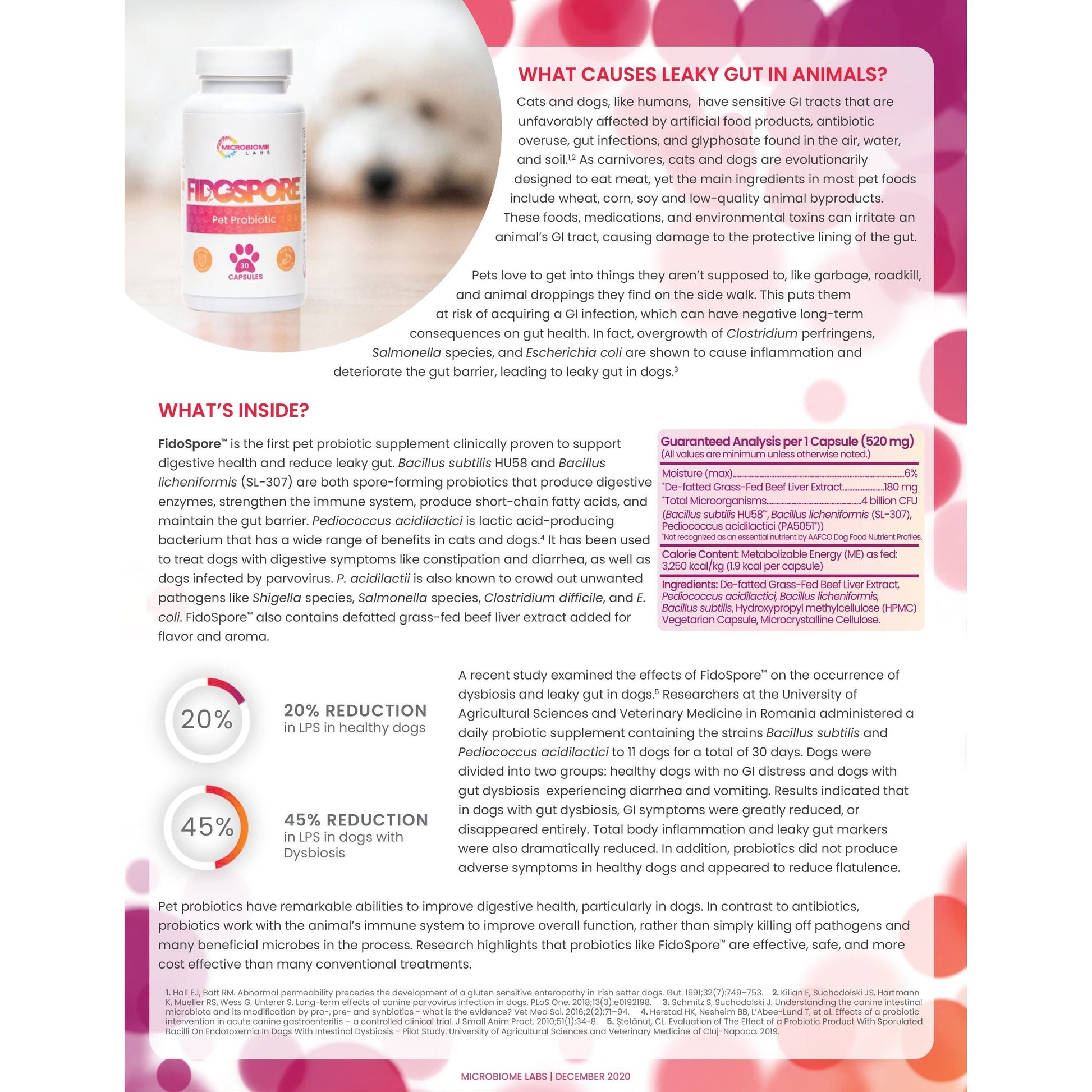 FidoSpore™ is the first probiotic supplement clinically shown to support digestive health and reduce leaky gut in dogs. FidoSpore™ contains a unique blend of Bacillus subtilis HU58, Bacillus lichenformis (SL-307), and Pediococcus acidilactii mixed with irresistible defatted, grass-fed beef liver for flavor and aroma. In fact, a recent study exploring gut dysbiosis in dogs found that FidoSpore™ dramatically reduces inflammation, diarrhea, and vomiting in as little as 30 days.