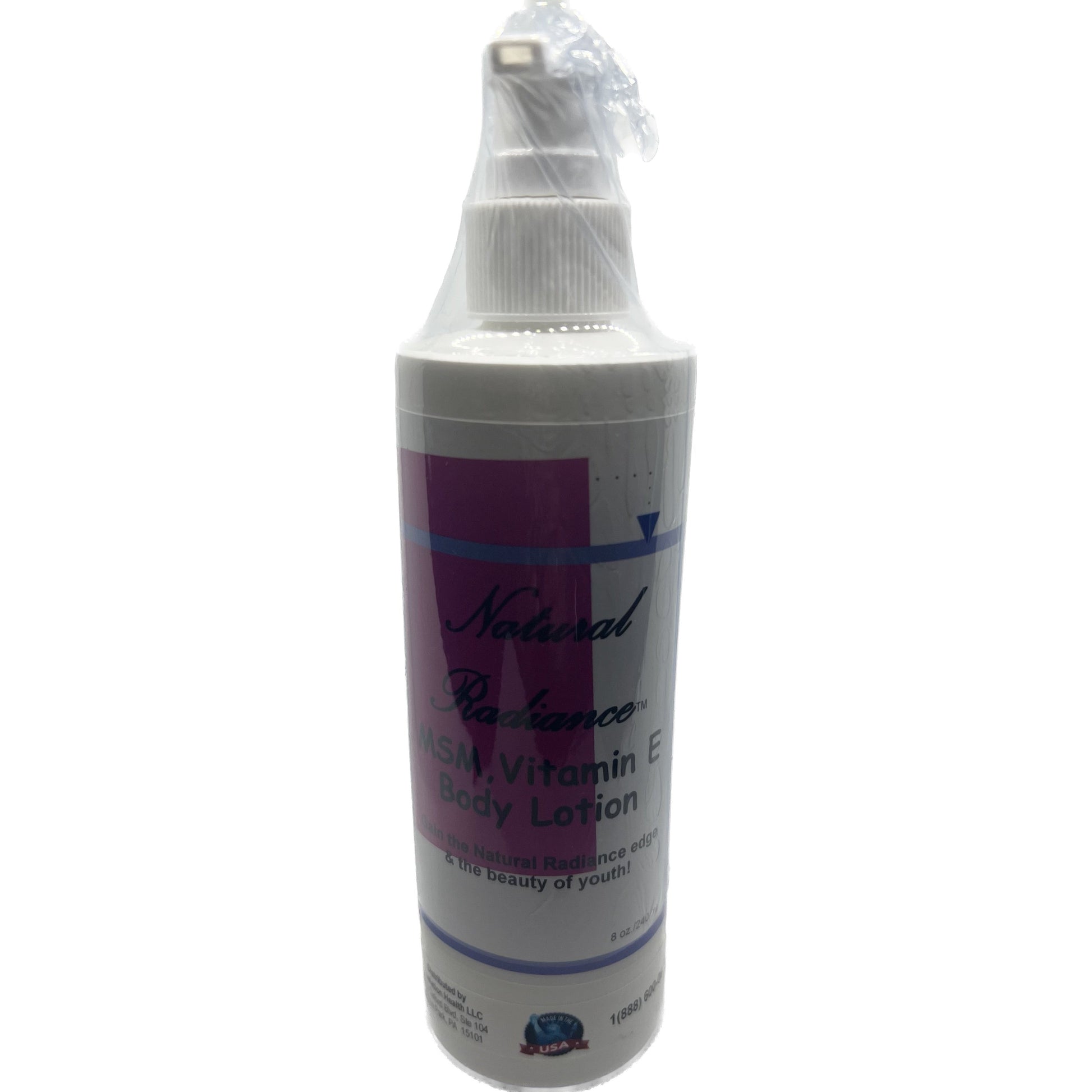 Natural Radiance™ MSM Vitamin E Lotion, 8oz pump bottle, is formulated to hydrate and nourish the skin morning and evening. This all-over body lotion provides the benefits of MSM, Vitamin E and Aloe Vera to soften and moisturize the skin. MSM is a organic source of biological sulfur, a mineral essential for skin cell health and has anti-inflammatory properties. Vitamin E is a powerful antioxidant and helps protect the skin from UV light, pollution, drugs and other elements that produce cell damaging free radicals. Aloe Vera contains more than 200 biologically active amino acids, vitamins, antioxidants, minerals, enzymes and sterols. Aloe Vera is one of the best organic, natural, skin care ingredients available.