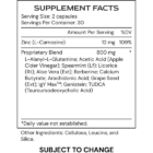 Zinc, L-Alanyl-L-Glutamine, Acetic Acid (Apple City Vinegar), Spearmint (lf), Licorice (rt), Aloe Vera (ext), Berberine, Calcium Butyrate, Arachidonic Acid, Grape Seed (ext), IgY Max, Genistein, TUDCA (Tauroursodeoxycholic Acid)