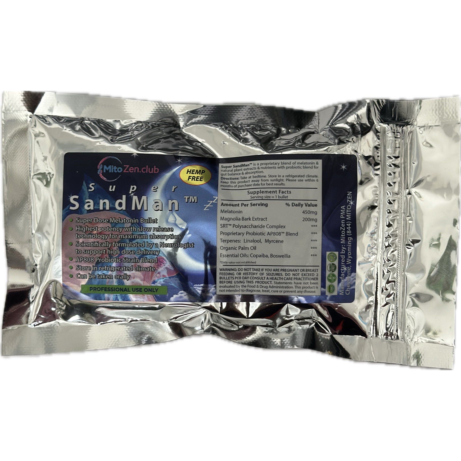 Super SandMan without CBD contains 450mg of Melatonin, Terpenes, a Proprietary blend of SandMan Complex™ along with our proprietary AP0-808™ probiotic strain. There is a slow release over a 5-7 hour period, to support sleep all night long due to our proprietary slow release technology using SRT ™ Polysaccharide Complex. Serving: 15