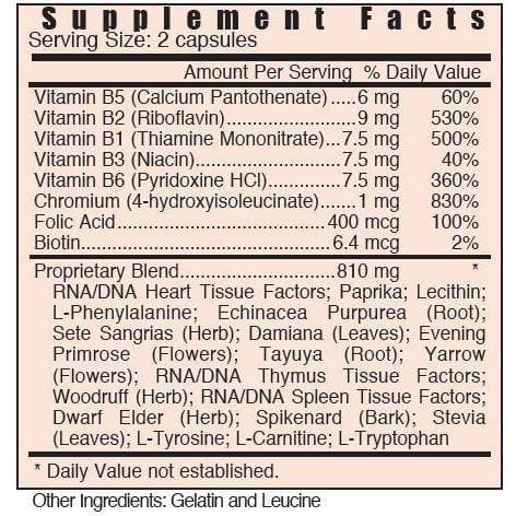 INGREDIENTS: Calcium (Pantothenate), Riboflavin, Thiamin, Niacin, Vitamin B6, Chromium (Chelate), Folic Acid, Biotin, RNA/DNA Heart Tissue Factors, Riboflavin, Phenylalanine, Sete Sangrias (Whole), Tayuya (Root), RNA/DNA Thymus Tissue Factors, Woodruff (Whole), RNA/DNA Spleen Tissue Factors, Tyrosine, L-Carnitine.