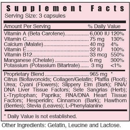 INGREDIENTS: Vitamin A (Beta Carotene), Vitamin C, Calcium, Vitamin E, Vitamin B12, Manganese (Chelate), Potassium (Bitartrate), Orange Bioflavanoid, Collgen/Gelatin, Pfaffia (Root), Cyani (Flower), Urea, Slippery Elm (Bark), RNA/DNA Liver Tissue Factors, Sete Sangrias (Whole), Lemon Bioflavanoid, L-Tryptophan, RNA/DNA Heart Tissue Factors, Cinnamon (Bark), Hawthorne (Berries), Stevia (Leaves), Phenylanine, Cassia (Bark), Hesperdin, Sequoia (Bark), Paprika.