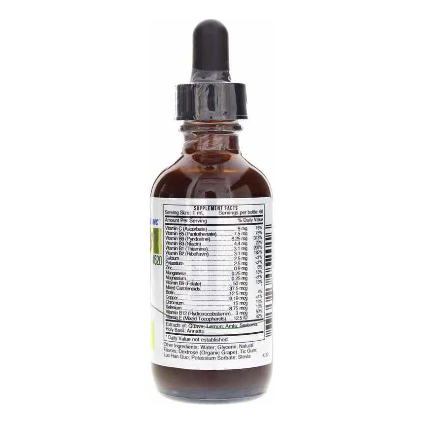 Vitamin A, Beta Carotene, Vitamin C, Vitamin D, Vitamin E, Vitamin K1, Vitamin B1, Vitamin B2, Vitamin B3, Vitamin B6, Vitamin B9, Vitamin B12, Biotin, Vitamin B5, Calcium (Citrate), Iodine, Magnesium (Chelate), Zinc Ascorbate, Selenium, Manganese, Copper, Chromium, Molybdenum, Potassium Citrate, Choline (Bitartrate), Inositol, Para Amino Benzoate, CoQ10, Water, Glycerin, Xylitol, Rice Extract, Xanthan Gum, Natural Tropical Fruit Flavors, Beta-Glucan, Acai Fruit, Gogi Fruit, Mango Fruit, Red Raspberry Fruit, Potassium Sorbate.
