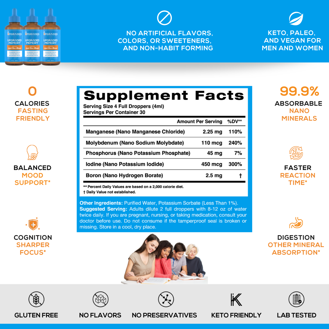 Upgraded Memory is a pure dose of Key Brain Minerals that helps you replenish, stay on task, become more creative, retain information, and remember all those important conversations over time by supporting these commonly low levels of key brain minerals.